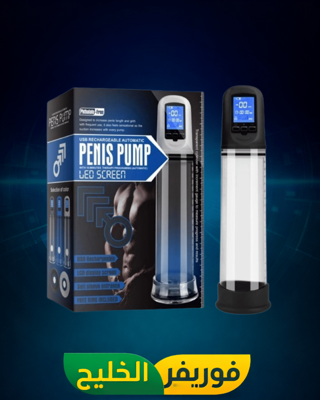 جهاز بينس بامب الإلكتروني جهاز عناية رجالية يعمل بتقنية الضغط الإلكتروني مع شاشة رقمية، تحكم ذكي، تصميم عملي ومناسب للاستخدام المنزلي.